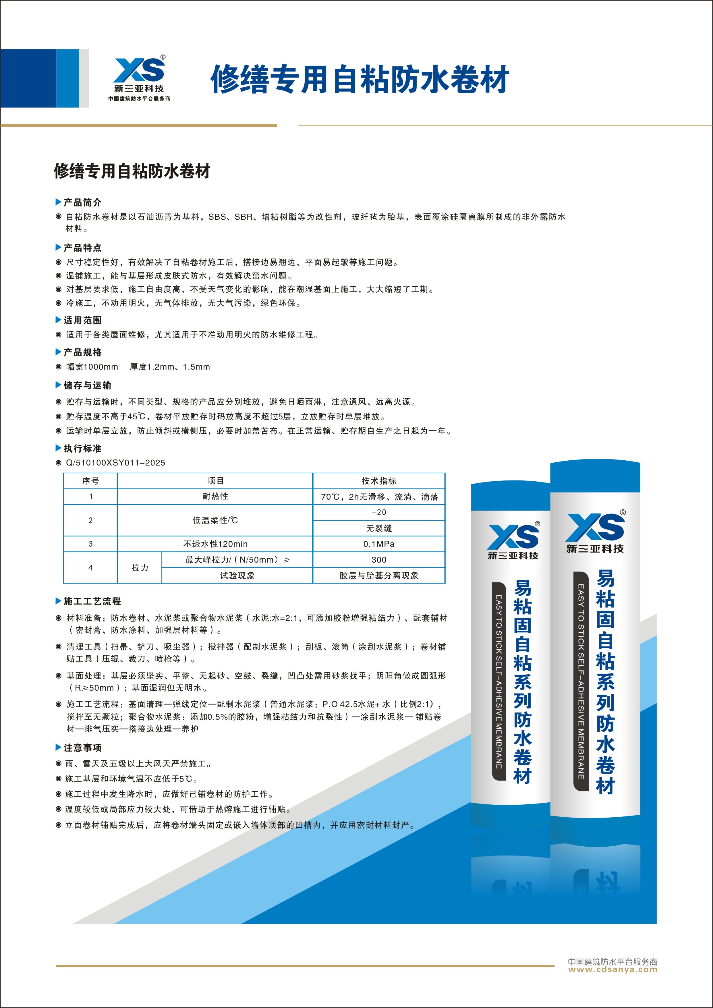 產品簡介 修繕專用自粘防水卷材是以石油瀝青為基料,SBS、SBR、增粘樹脂等為改性劑,玻纖氈為胎基,表面覆涂硅隔離膜所制成的非外露防水材料。 規(guī)格:1.5mm*10 m | ![]() |