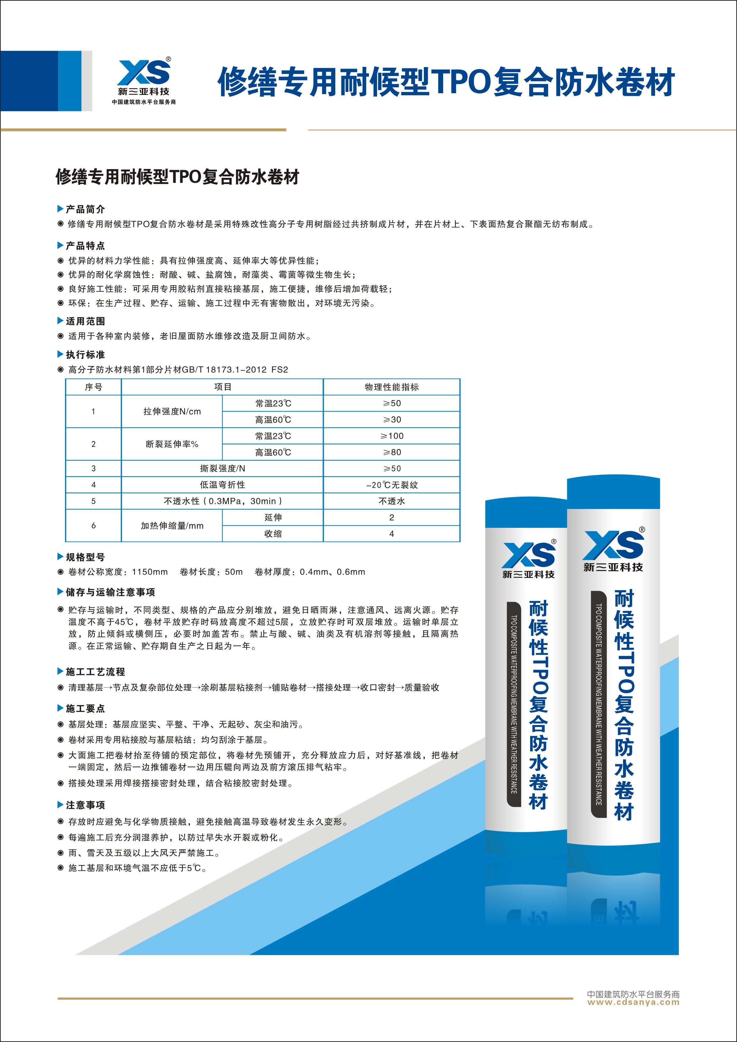 產品簡介: 修繕專用耐候型TPO復合防水卷材是采用特殊改性高分子專用樹脂經過共擠制成片材,并在片材上、下表面熱復合聚酯無紡布制成。 規(guī)格:FS2-TPO-50.0m×1.15m×0.6mm | ![]() |